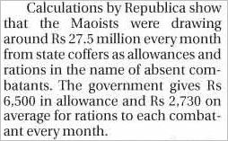 Er zijn verschillende issues die om aandacht vragen. Zoals: was de schatting over het aantal PLA strijders van de Verenigde Naties indertijd wel correct? Er zijn nu drieduizend combatants ‘zoek’. De Maoïsten ontvingen derhalve elke maand 27 miljoen roepie (270.000 euro) ten onrechte als allowances uit de staatskas.